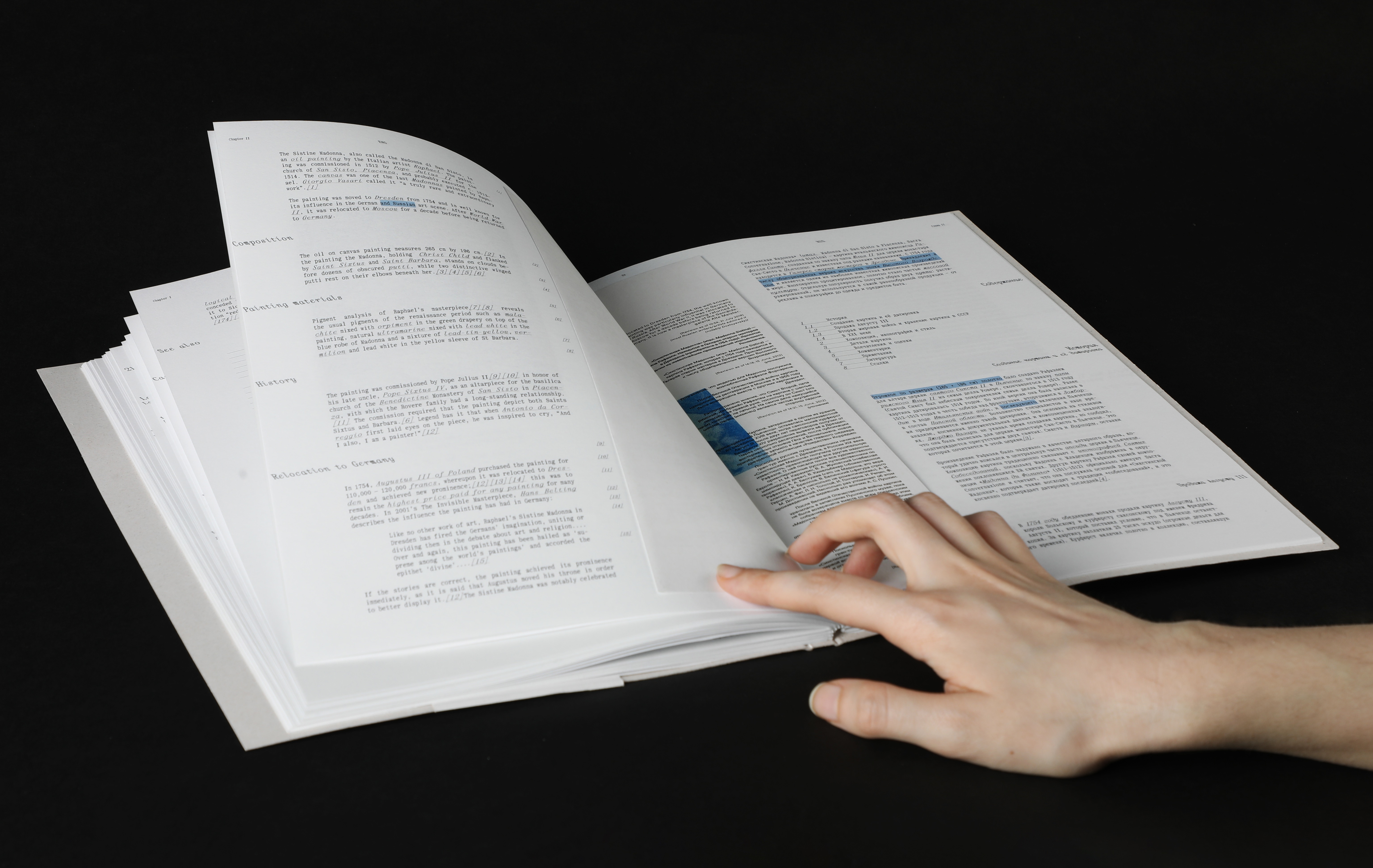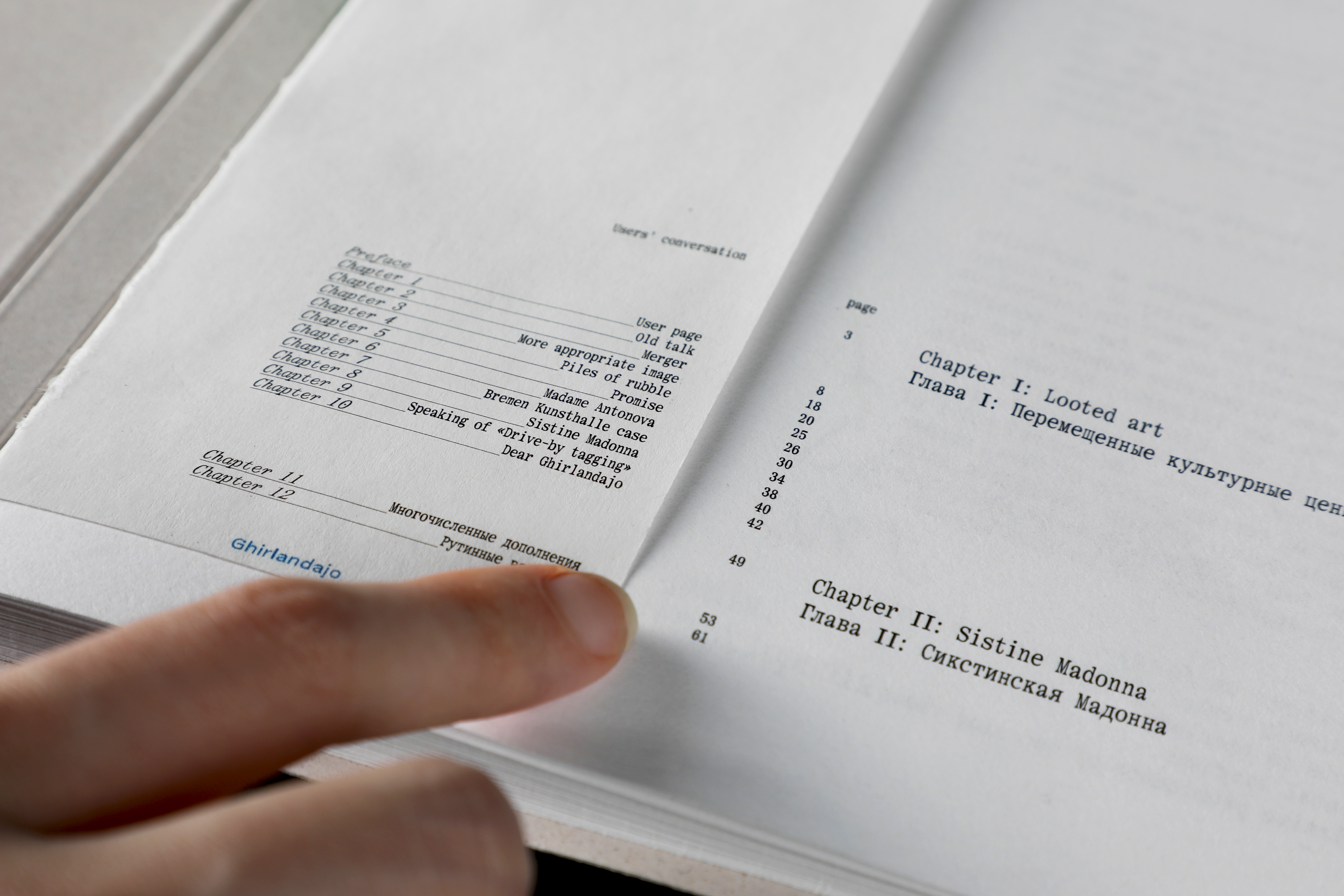 The book features English and Russian versions of two Wikipedia articles: “Looted Art” and “Sistine Madonna”, retrieved on the 5th of March 2024.
